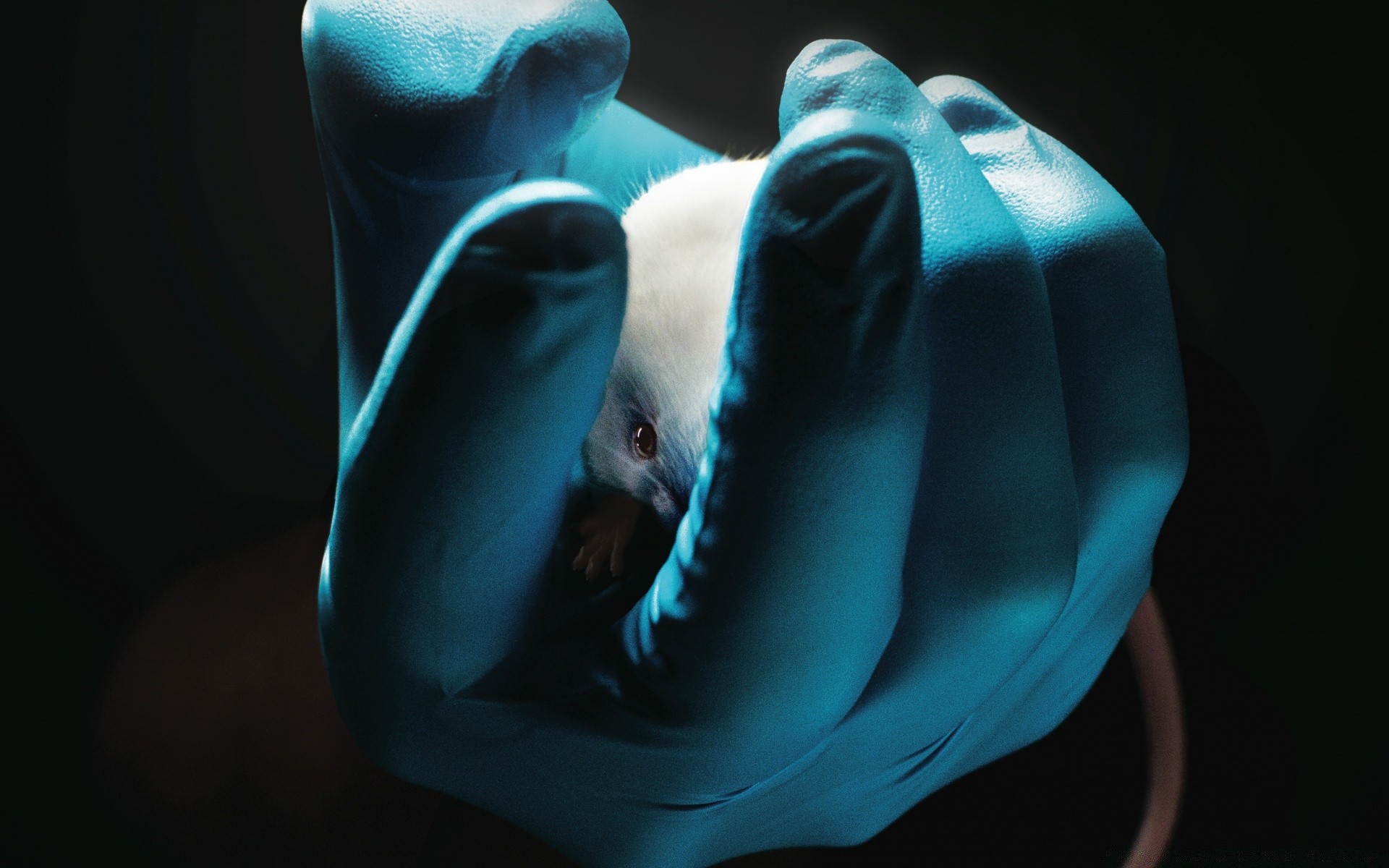 Hand in einem Gummihandschuh auf dunklem Hintergrund