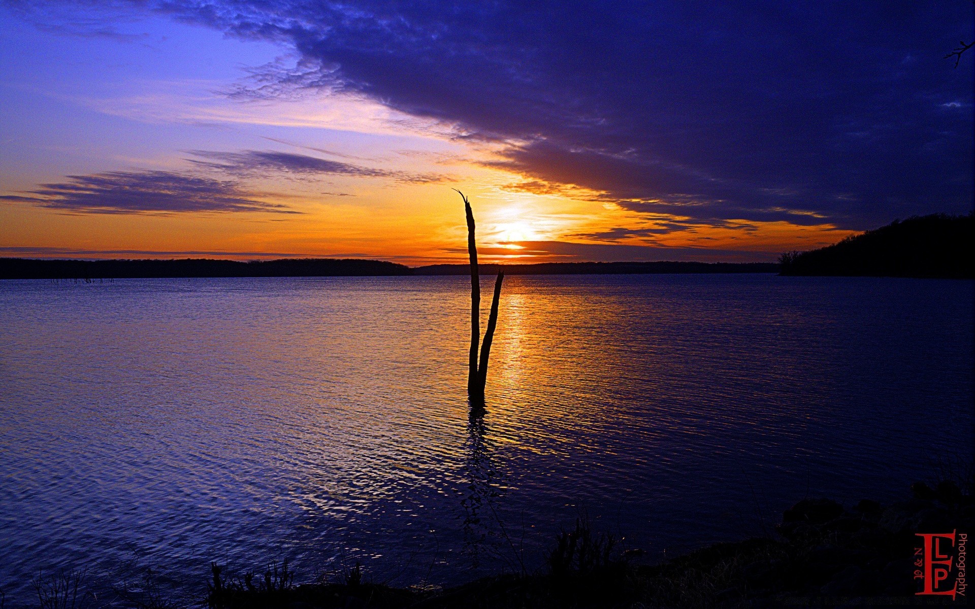 Einsamer Baumstamm, der sich über dem Seewasser im Hintergrund des Sonnenuntergangs erhebt