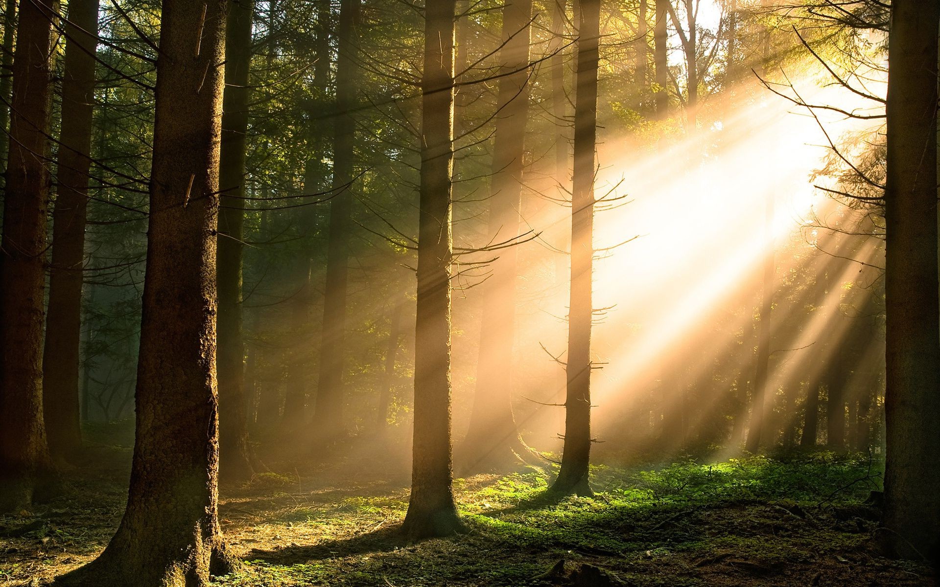 Die Sonnenstrahlen, die sich durch die Baumkronen bewegen