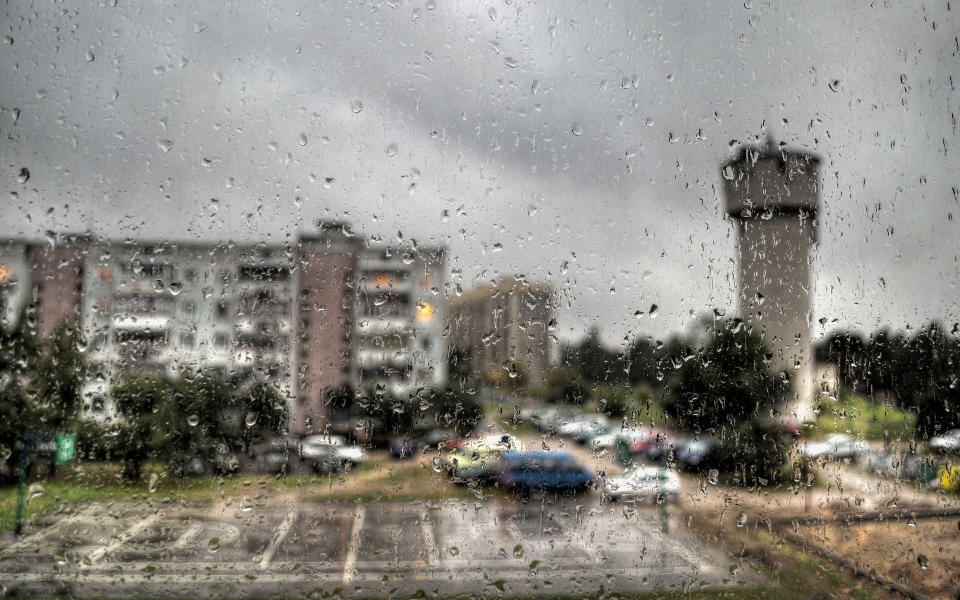 Blick aus dem Fenster auf die regnerische Stadt