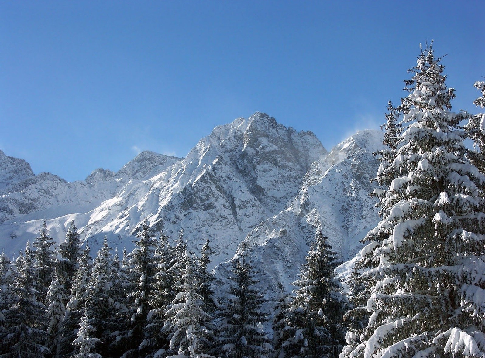 Die Sonne erhellt die Spitzen der schneebedeckten Tannen