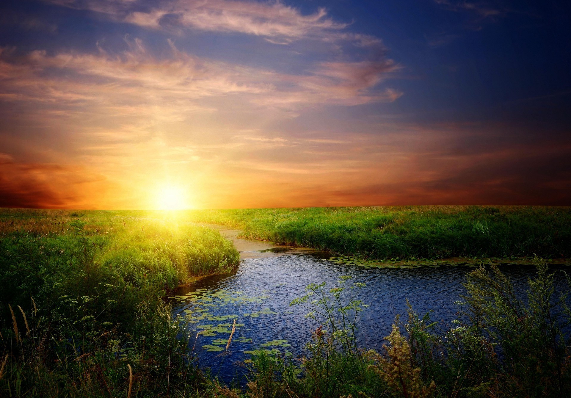 Fluss im grünen Gras bei Sonnenuntergang