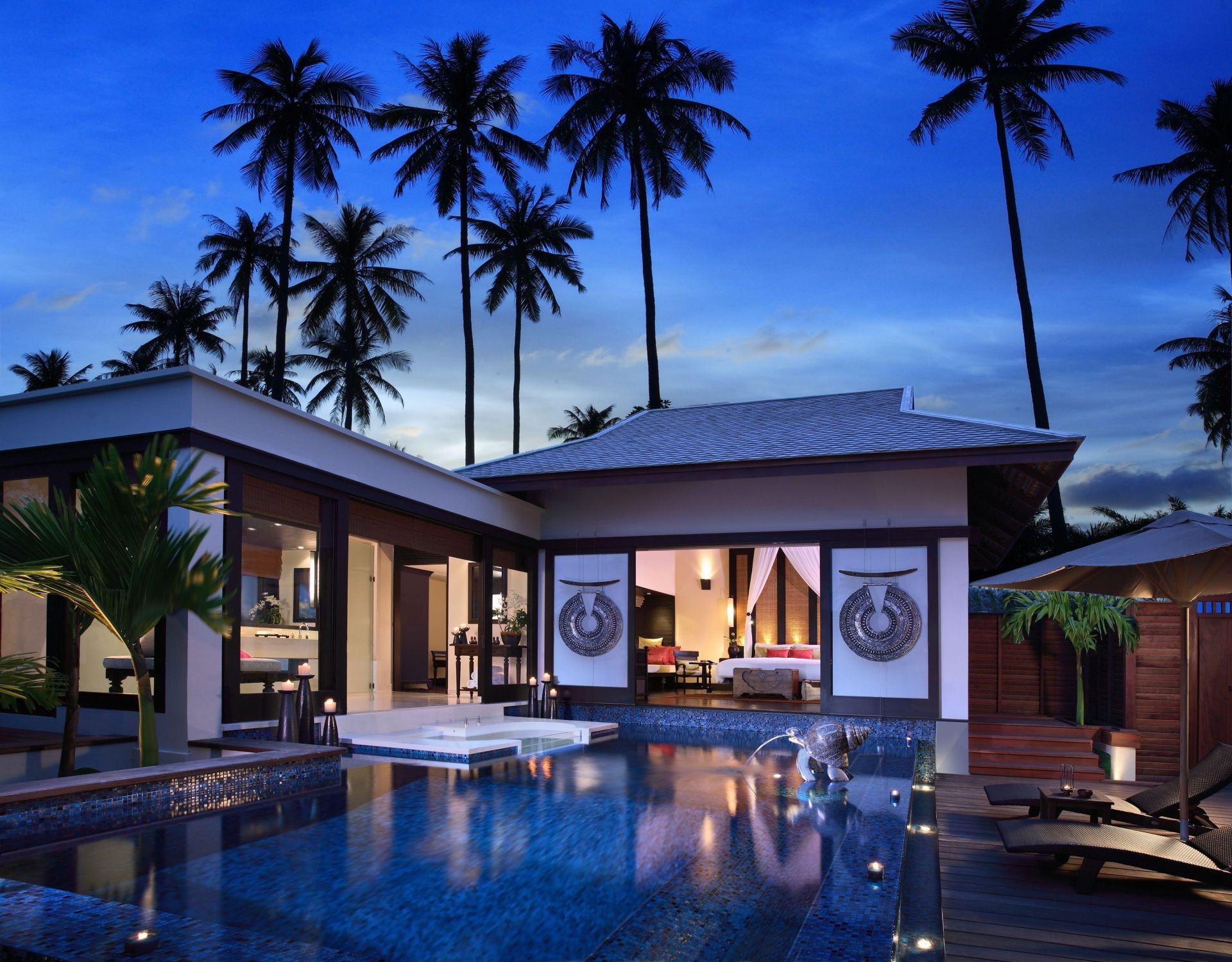 Ferienhaus mit Pool, umgeben von Palmen und Thuis