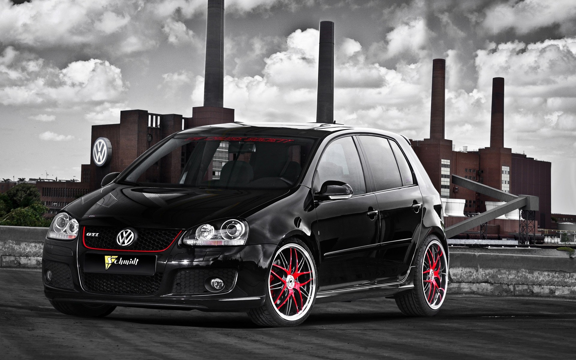 Schwarzer Volkswagen mit roten Scheiben fährt zum Werk