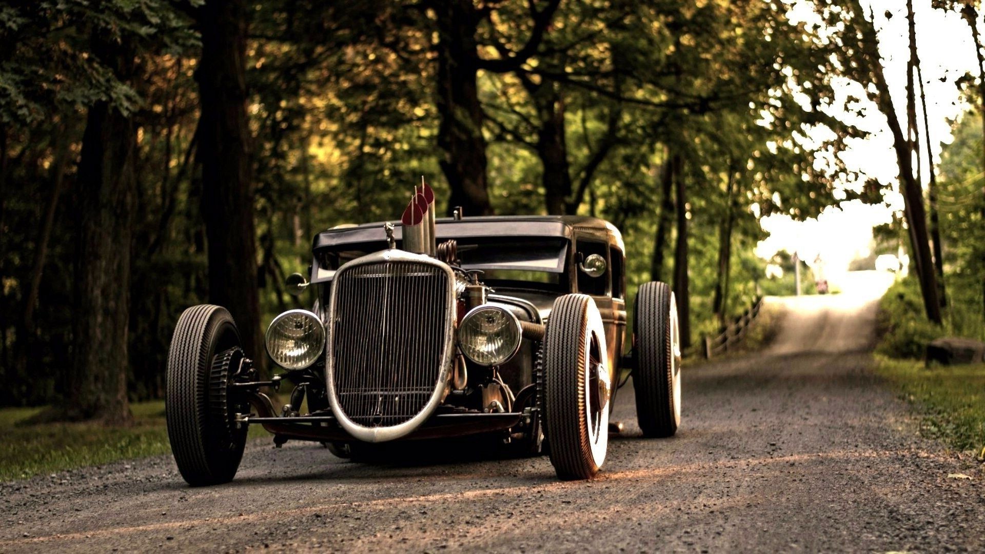 Ein grüner Pkw aus dem frühen 20. Jahrhundert mit klappbarem Oberteil und zwei Insassen