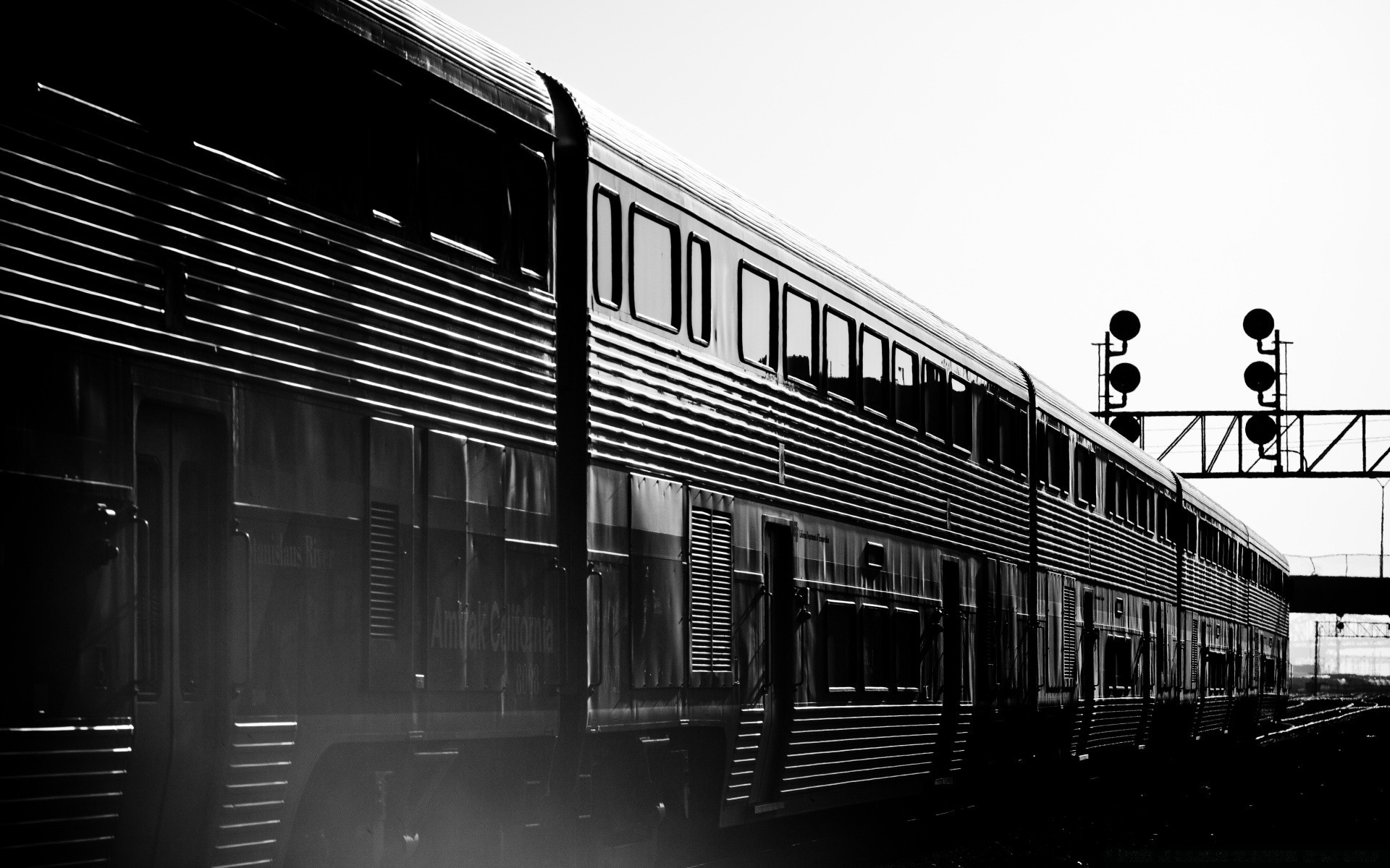 ELEKTRISCHER ZUG IM NEBEL AUF DEM HINTERGRUND DES RASENS IM NEBEL