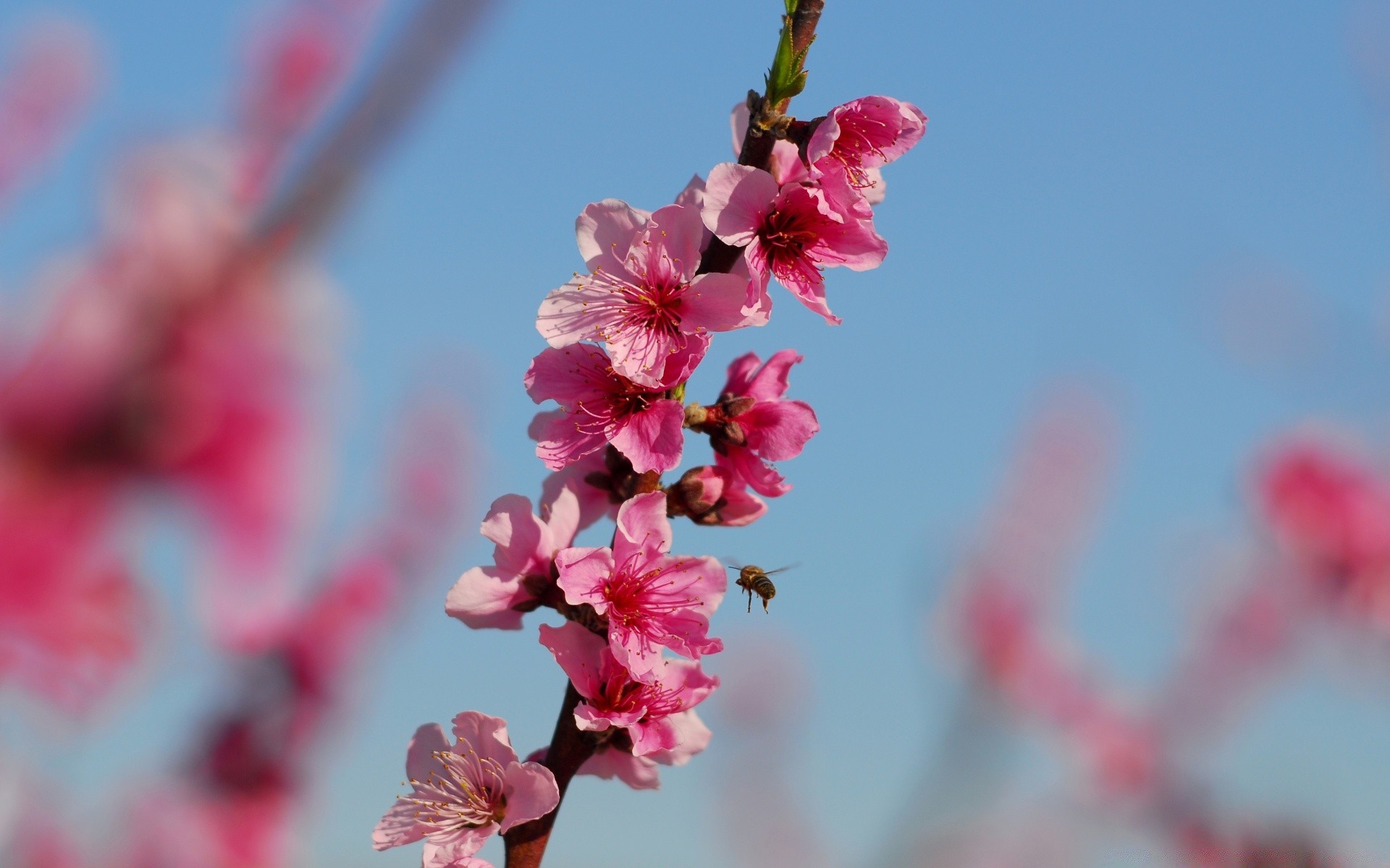 Ein kleines insekt flog zu einer hellen kirschblüte