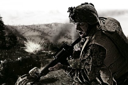 Militär mit Waffen bei Sonnenuntergang des Tages