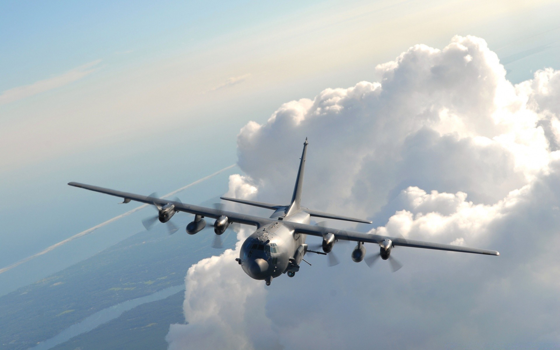 Militärflugzeug in dunkler Farbe auf Himmelshintergrund