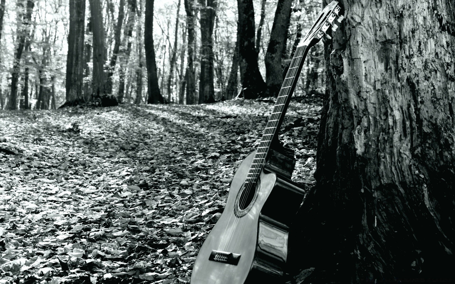 Eine einsame gitarre im wald erwartet ihren musikerEine einsame Gitarre im Wald erwartet ihren Musiker