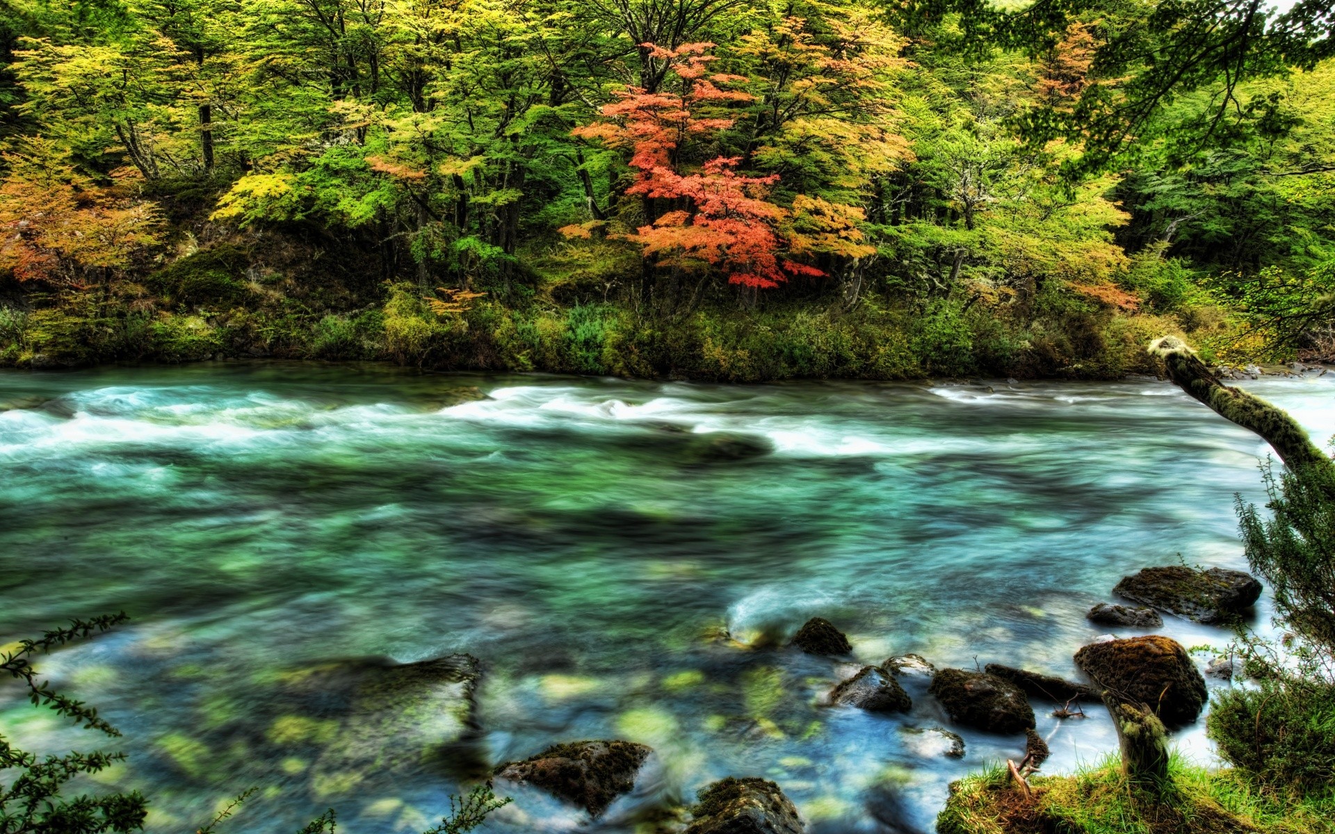Der fluss durchquerte im herbst einen zitternden waldDer Fluss durchquerte im Herbst einen zitternden Wald