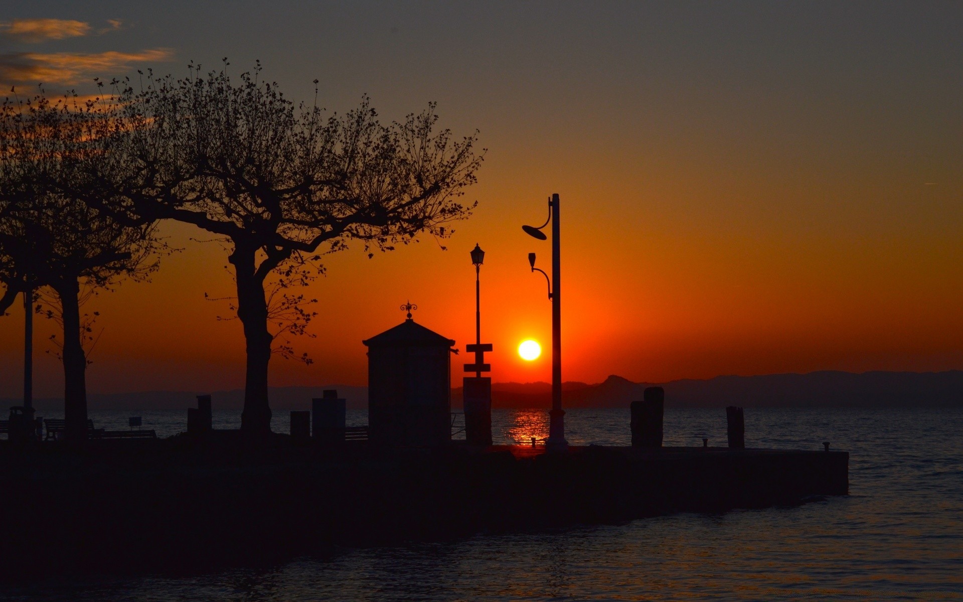 Schöner sonnenuntergang am wasser mit sonneneinstrahlungSchöner Sonnenuntergang am Wasser mit Sonneneinstrahlung