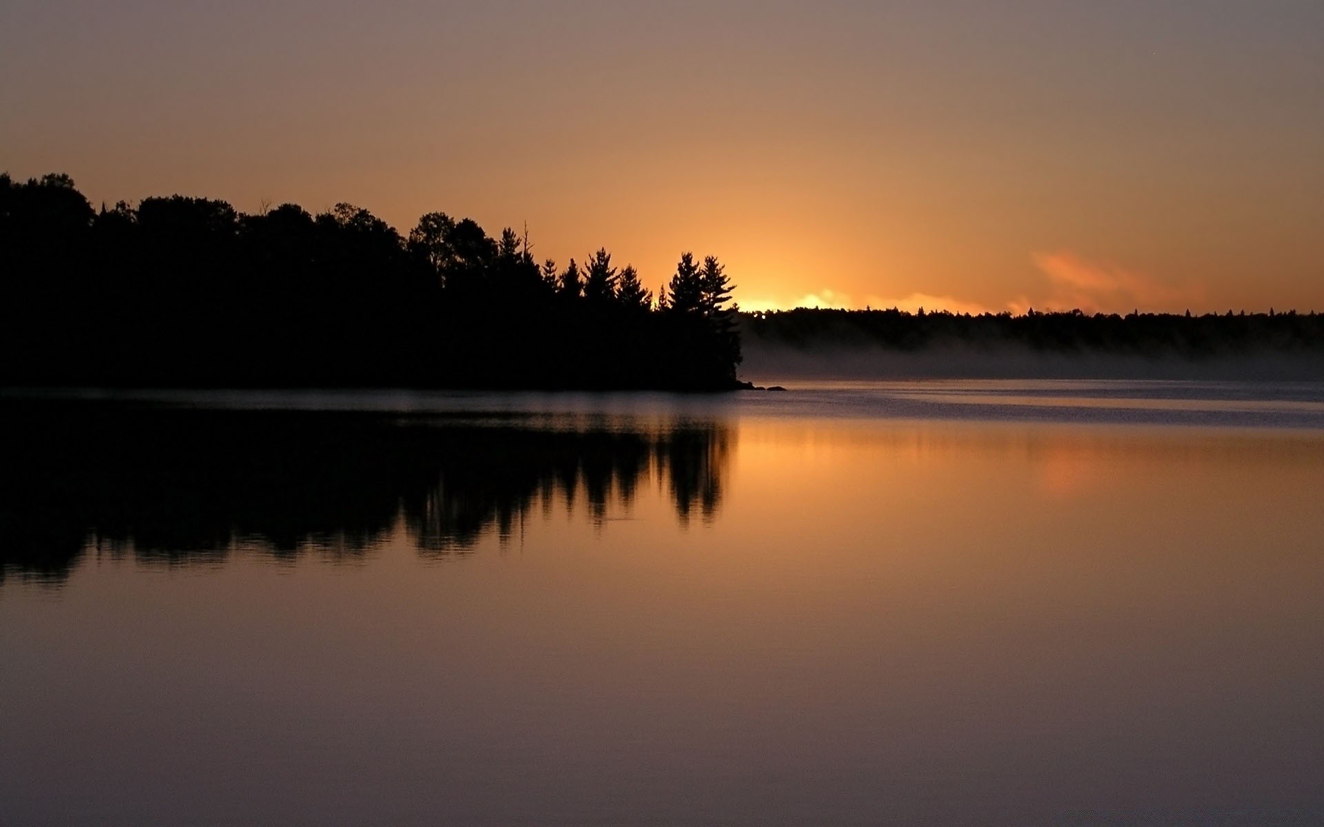 Morgendämmerung am see, reflexion der bäume im wasserMorgendämmerung am See, Reflexion der Bäume im Wasser