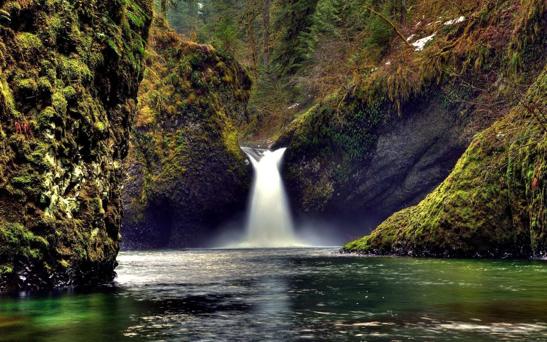 Ein Fluss mit einem grünen Farbton und einem Wasserfall
