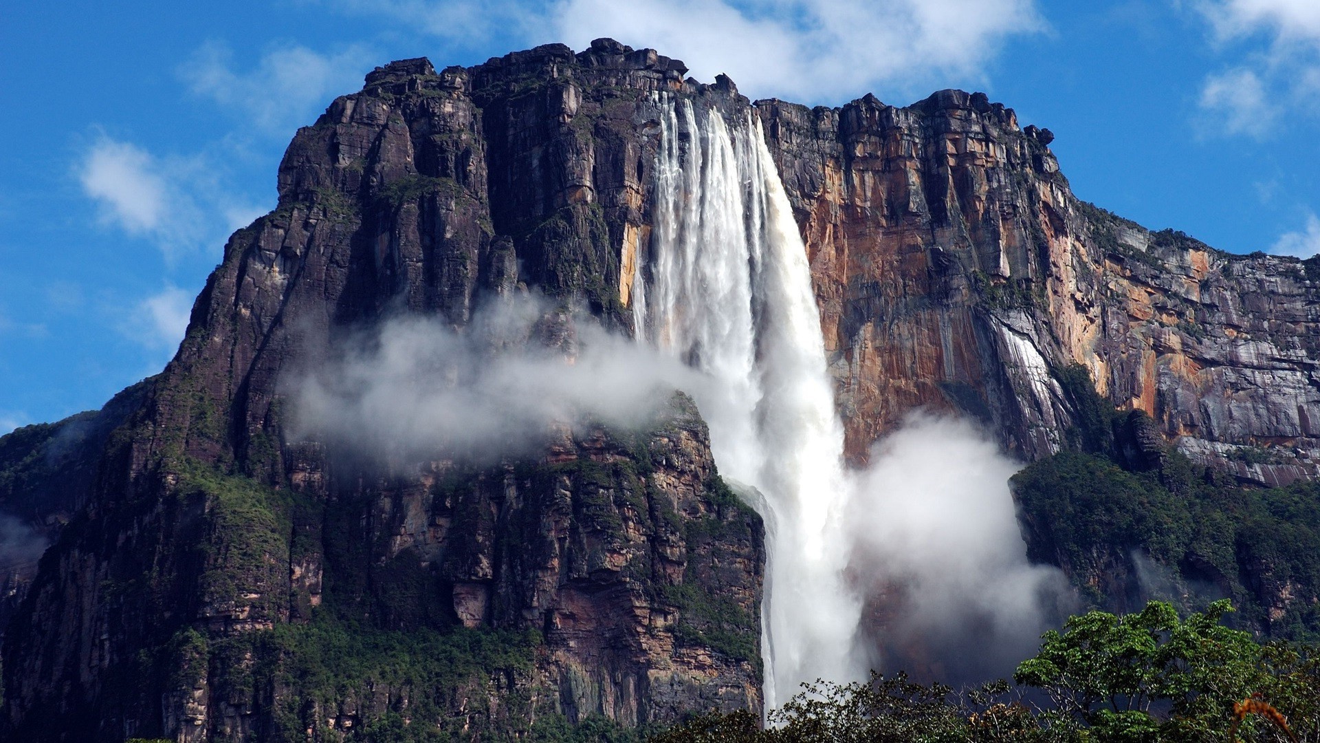 Wildtiere. Grüne Berge und Wasserfall auf blauem Himmel Hintergrund