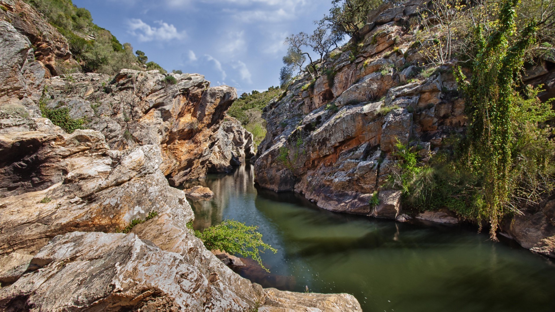 Düstere Landschaft. Der Mond erhellt den Fluss