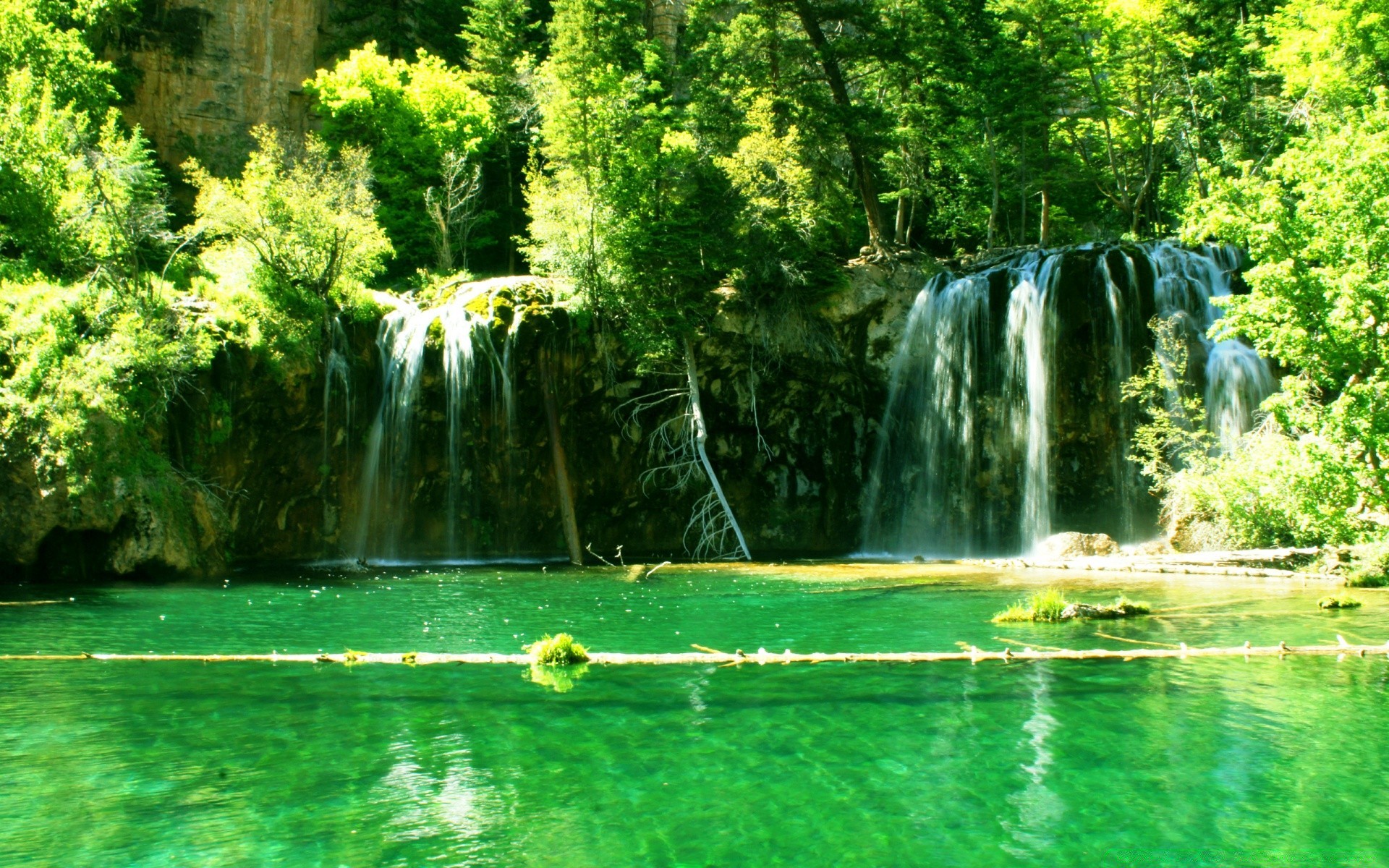 Viele wasserfälle bei sonnenuntergang in den bergenViele Wasserfälle bei Sonnenuntergang in den Bergen