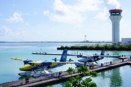 Das Flugzeug liegt am Wasser. Reisen. Das Meer