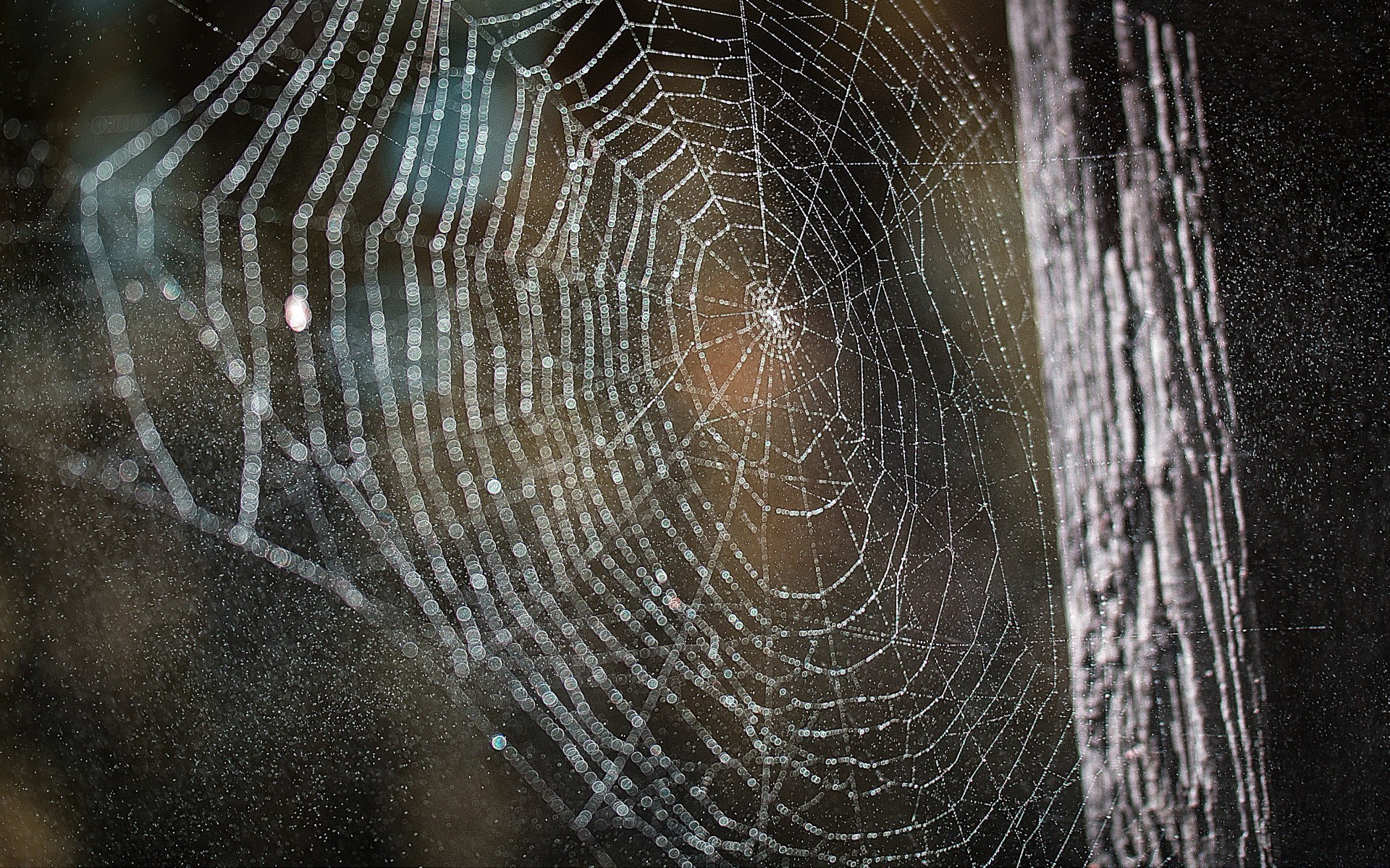 Nahaufnahme eines glänzenden Spinnennetzes auf einem Baum