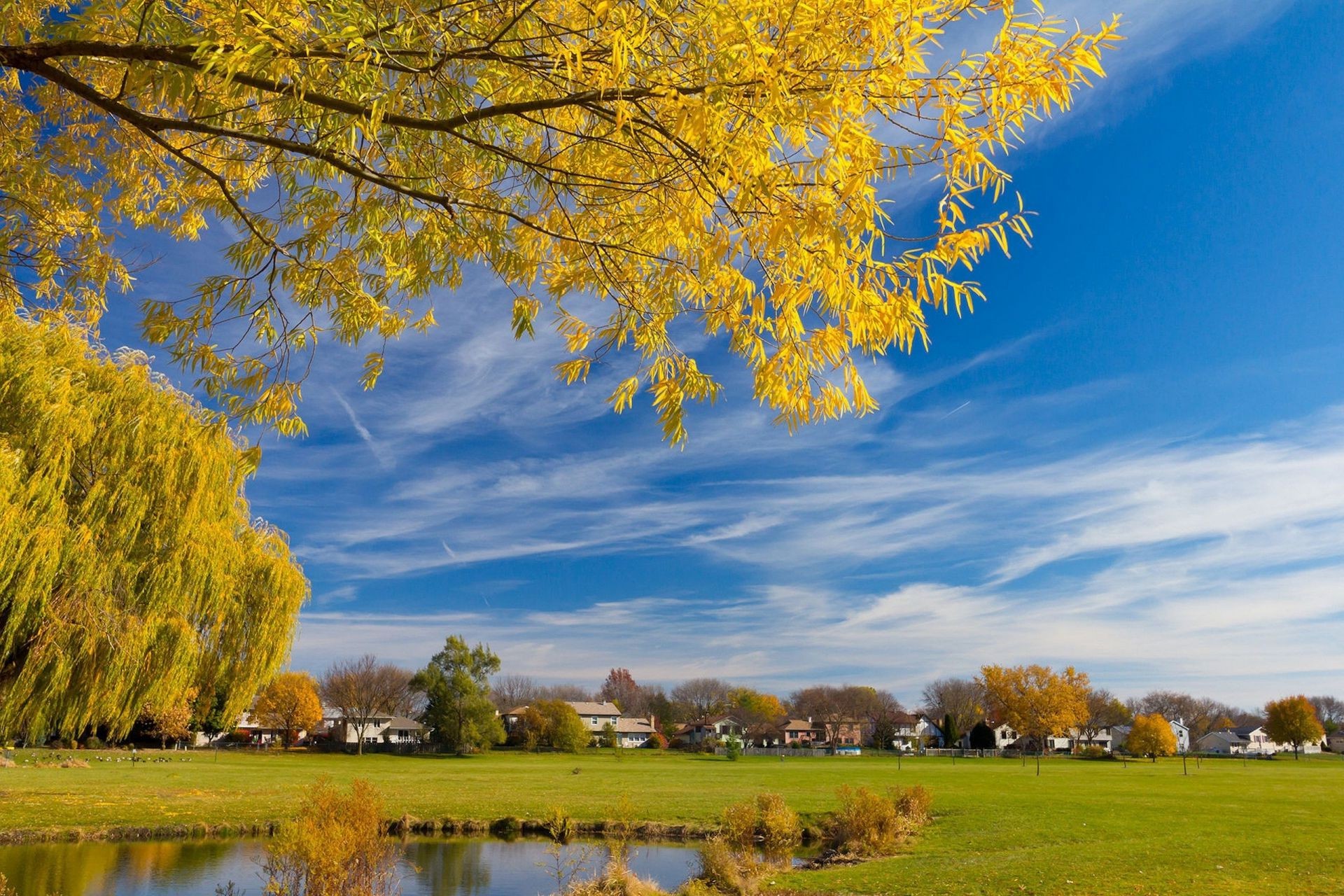Weide Teich Häuser Himmel Herbst Bäume Dorf Wiese Peiza