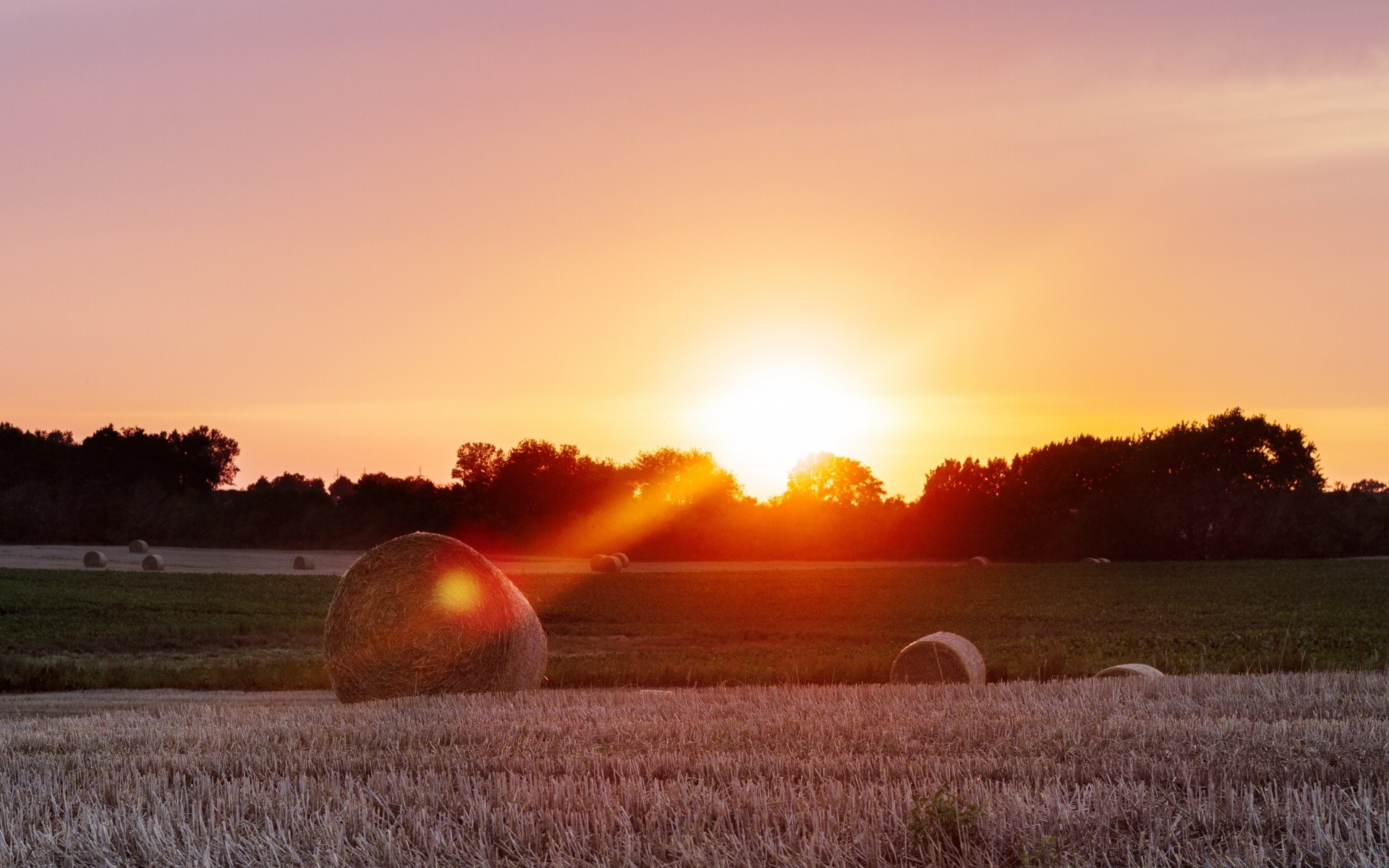Warmer sommerabend und sonnenuntergang über dem grünen feldWarmer Sommerabend und Sonnenuntergang über dem grünen Feld