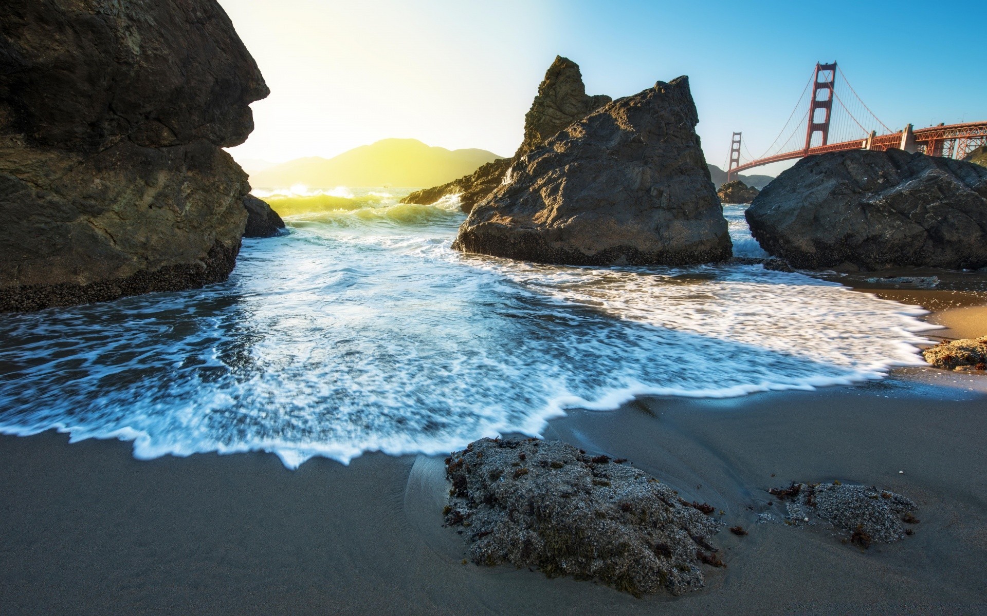 Ein felsiger strand erleuchtet den rosa sonnenuntergangEin felsiger Strand erleuchtet den rosa Sonnenuntergang