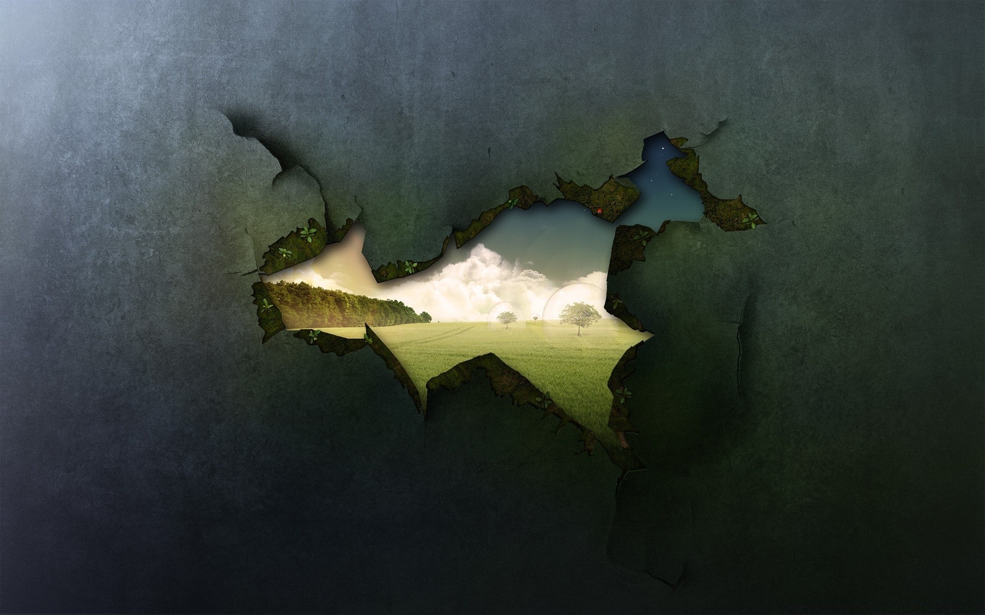 Phasen des abstrakten Denkens. Eine Welt aus einem Schwarzen Loch. Baum und Wolken auf schwarzem Hintergrund