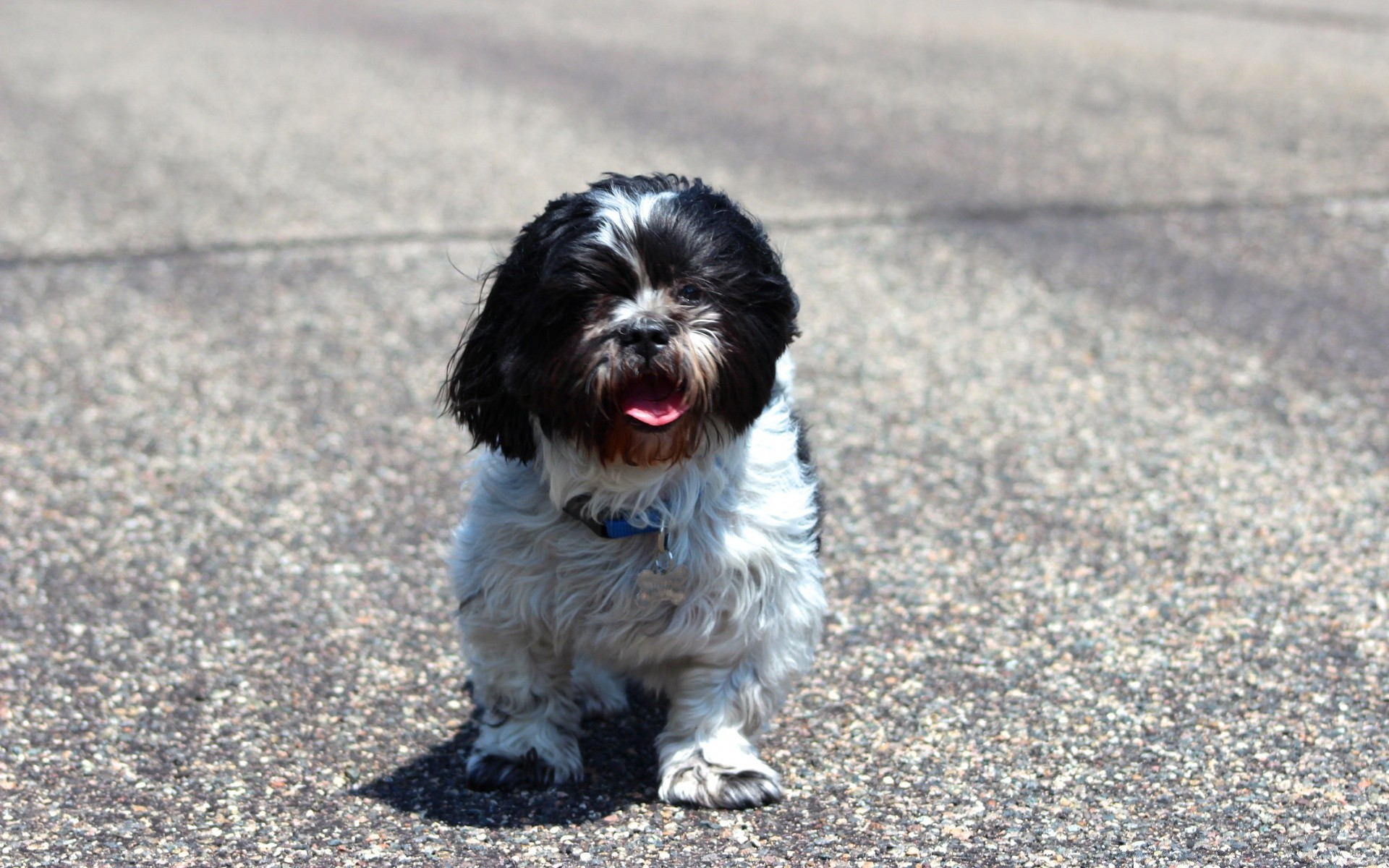 Der Hund steht auf grauem Asphalt