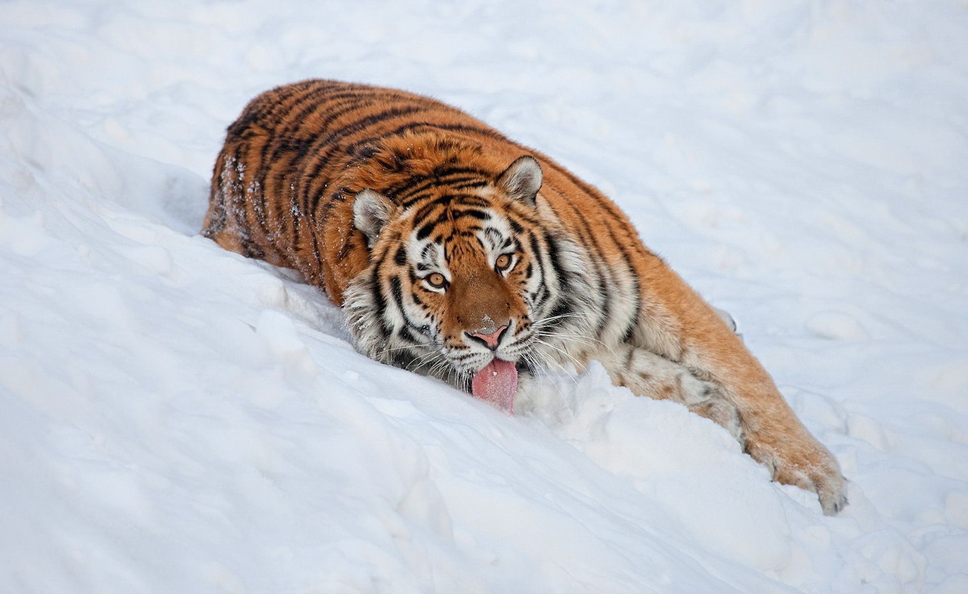 Gestreifter tiger fiel auf weißem schnee auseinanderGestreifter Tiger fiel auf weißem Schnee auseinander