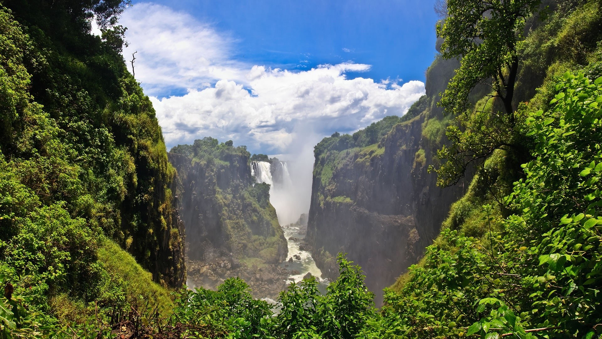 Wildtiere. Grüne Berge und Wasserfall auf blauem Himmel Hintergrund