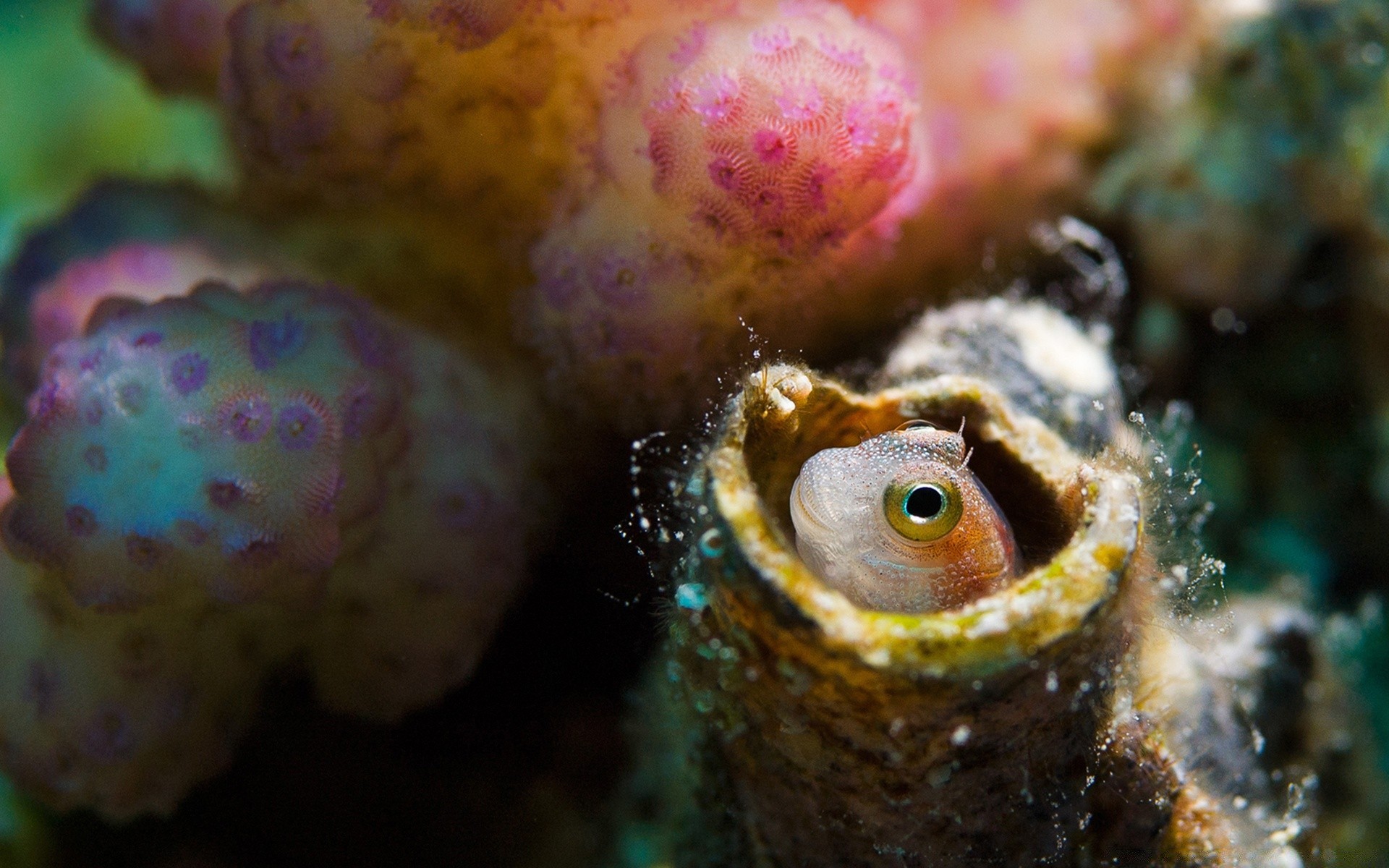 Meersklave, die vor dem Hintergrund von Korallen schaut