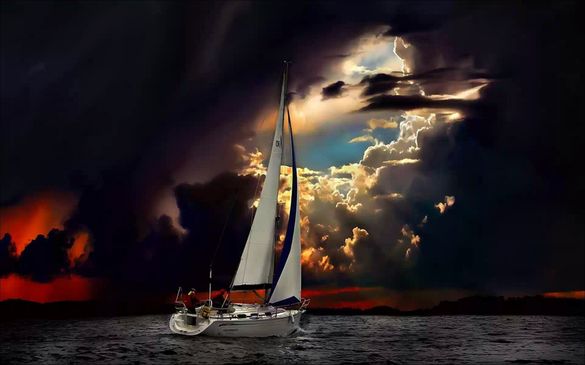 Das Segel einer einsamen Yacht vor dem Sturm wird weiß