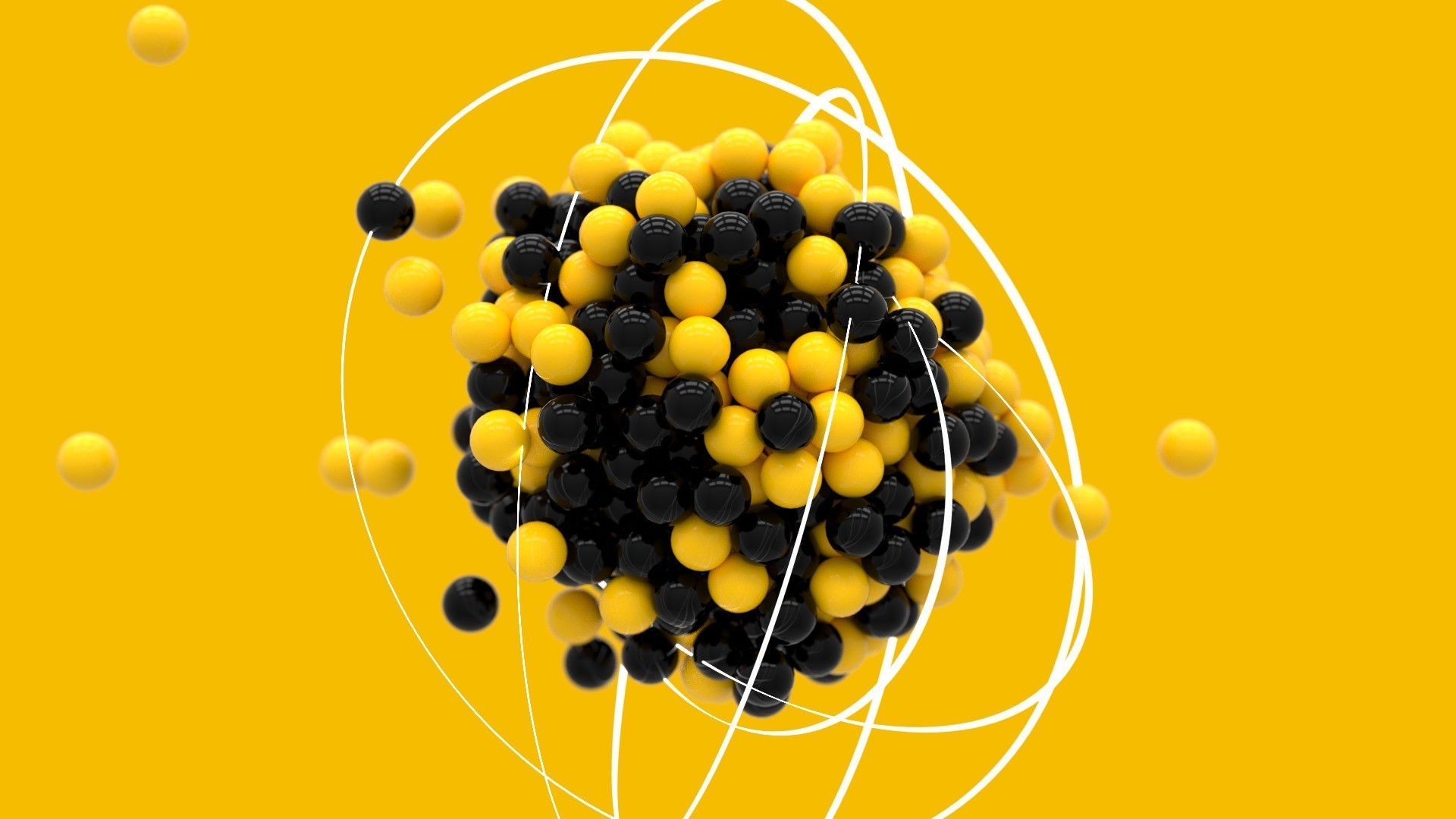 Gelbe und schwarze Kugeln im Zeichen des Atoms