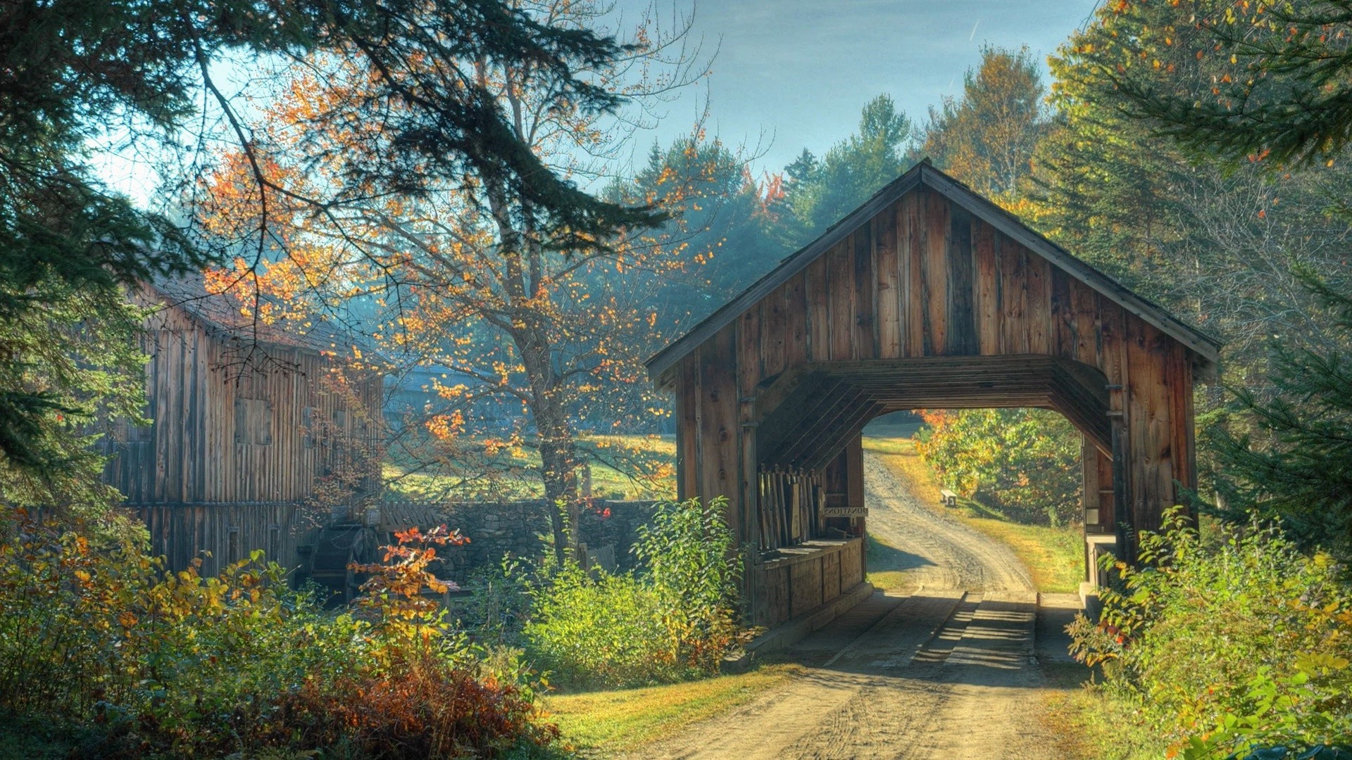Dorfstraße, die durch eine hölzerne Scheune führt