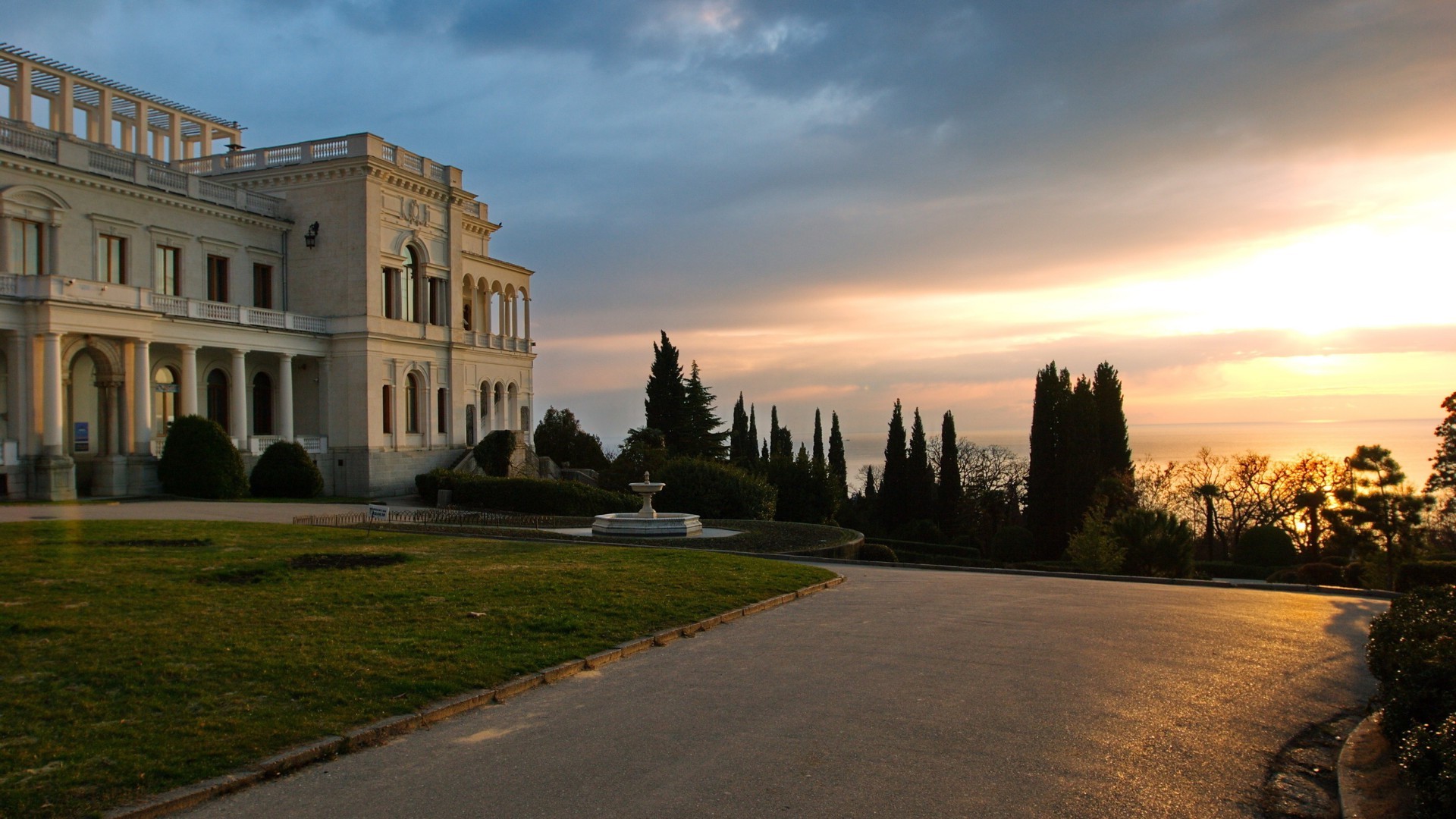 Krematorium. Altes Gebäude aus rotem Backstein. Kreuze am Himmel