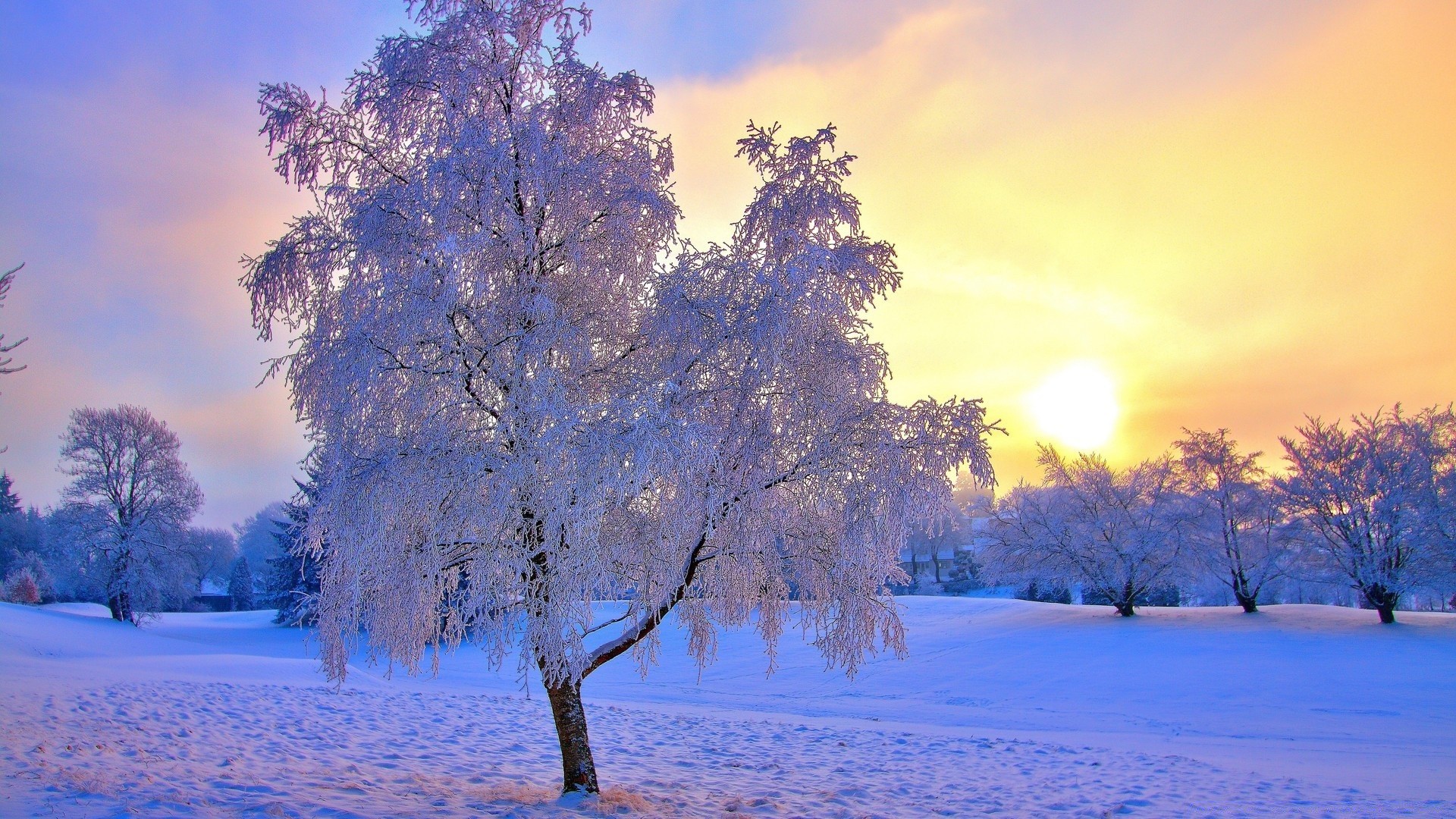 Baum im Winterwald bei Sonnenaufgang
