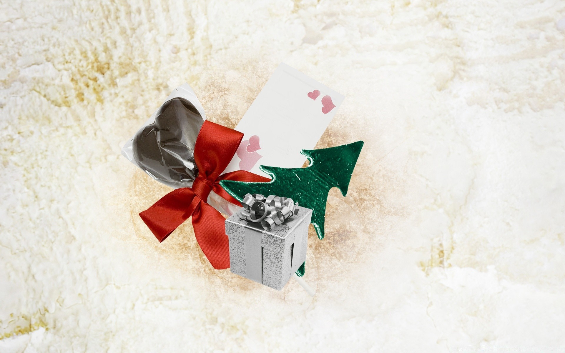 Rote Geschenkbox mit weißer Schleife unter Weihnachtsspielzeug und Tannenzweigen