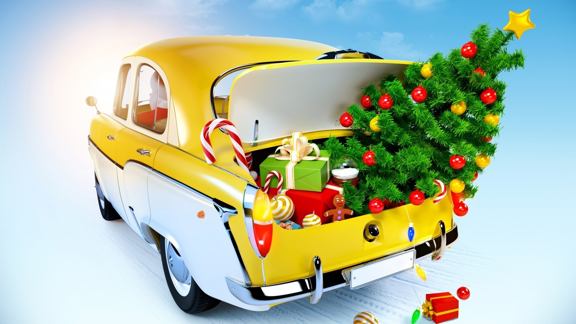 Gelbes auto trägt einen weihnachtsbaum und geschenke im kofferraumGelbes Auto trägt einen Weihnachtsbaum und Geschenke im Kofferraum