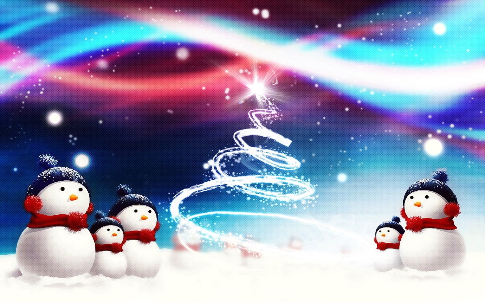Neujahrsbild mit Schneemännern und dem Bild eines Weihnachtsbaumes