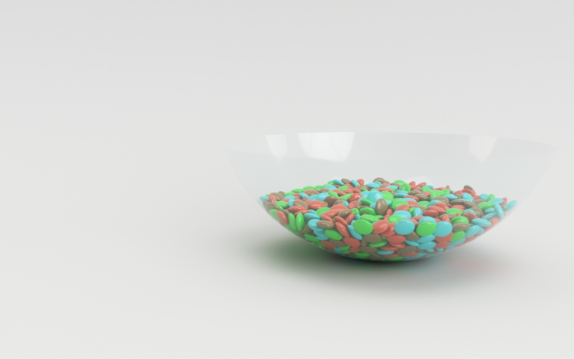 Farbige Dragees in einer transparenten Schale 3D-Grafik