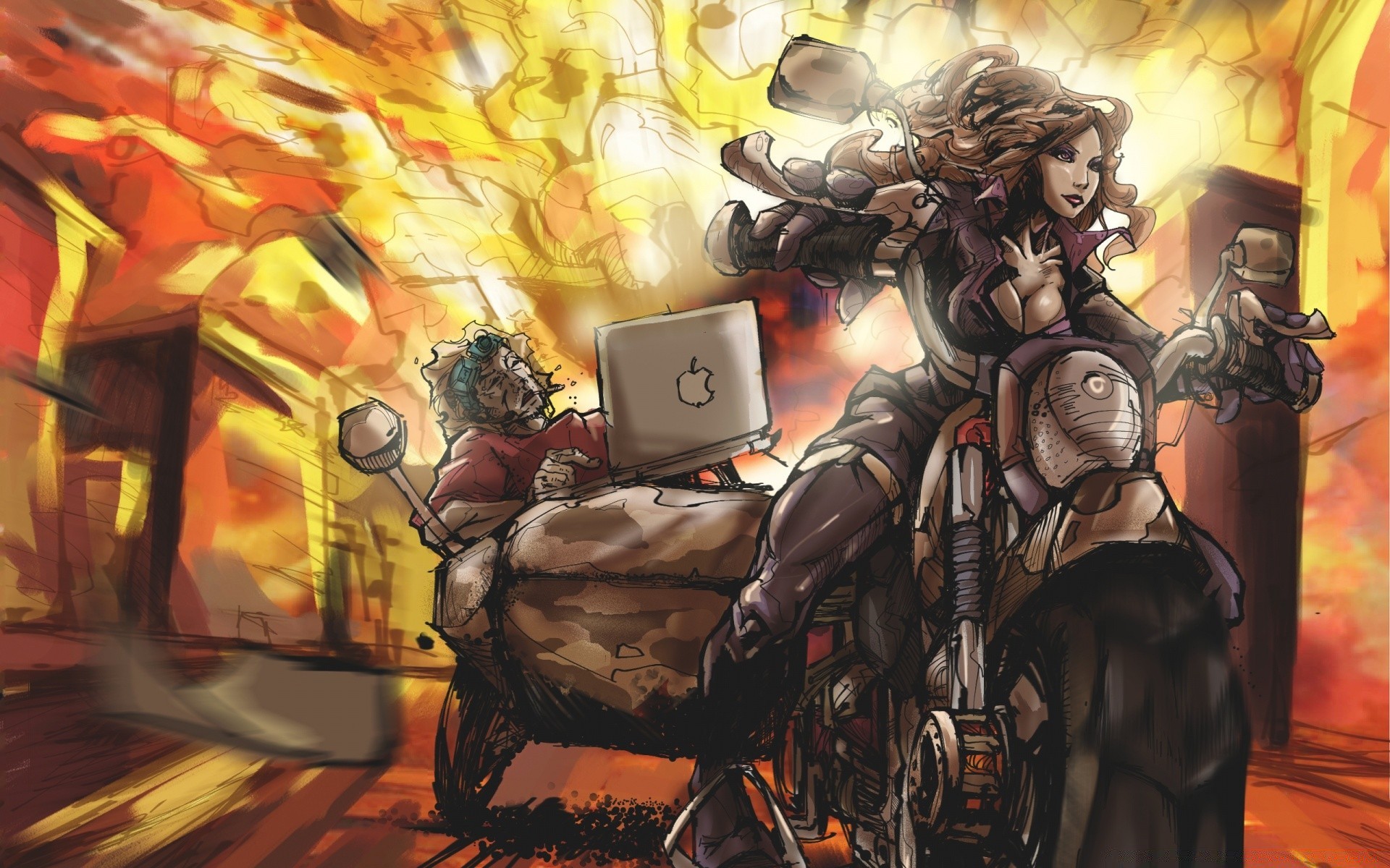 Abbildung einer frau auf einem motorrad mit einer explosionAbbildung einer Frau auf einem Motorrad mit einer Explosion