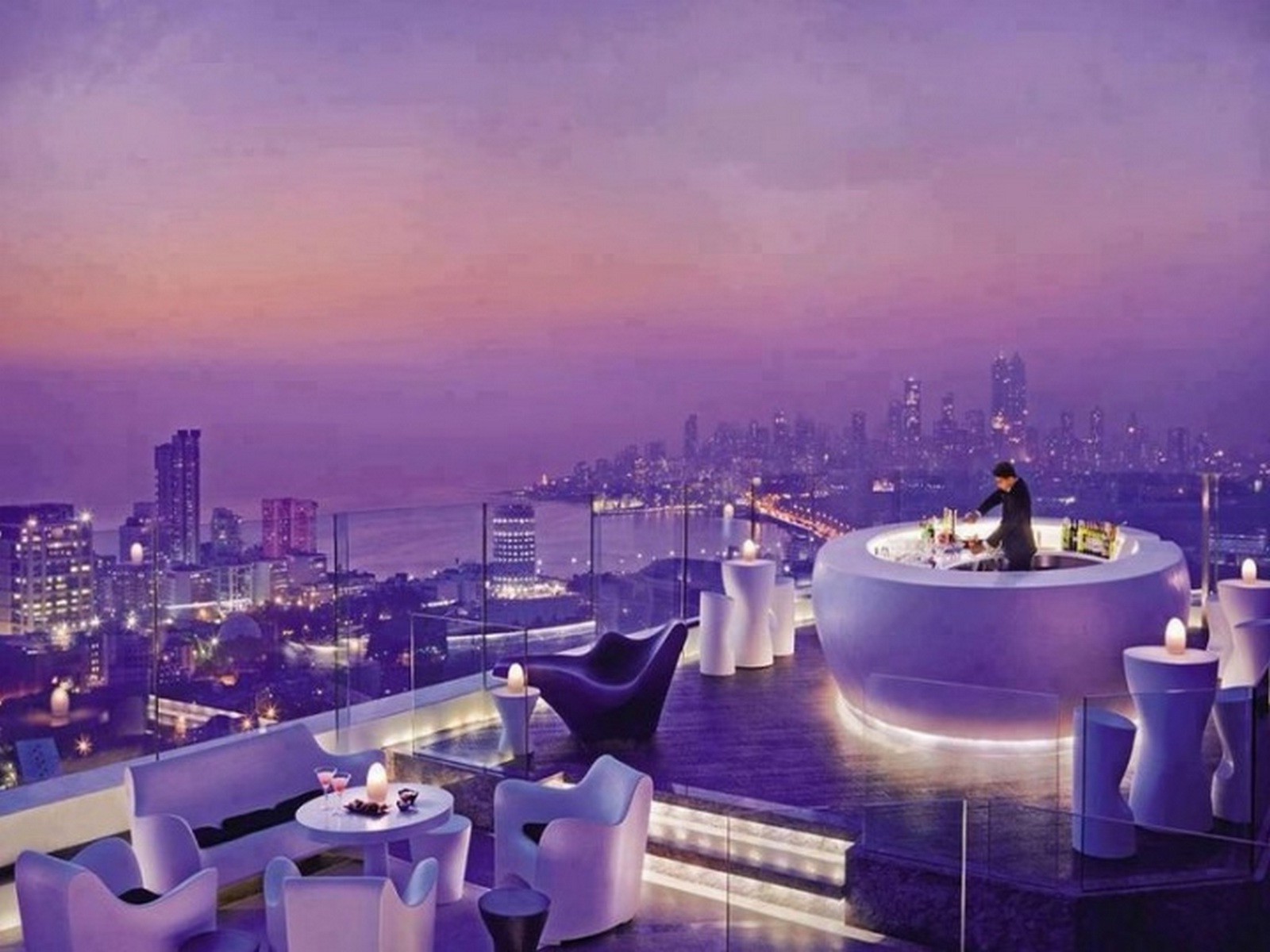 Lilafarbener Abend, urbane Landschaft, Café auf dem Dach