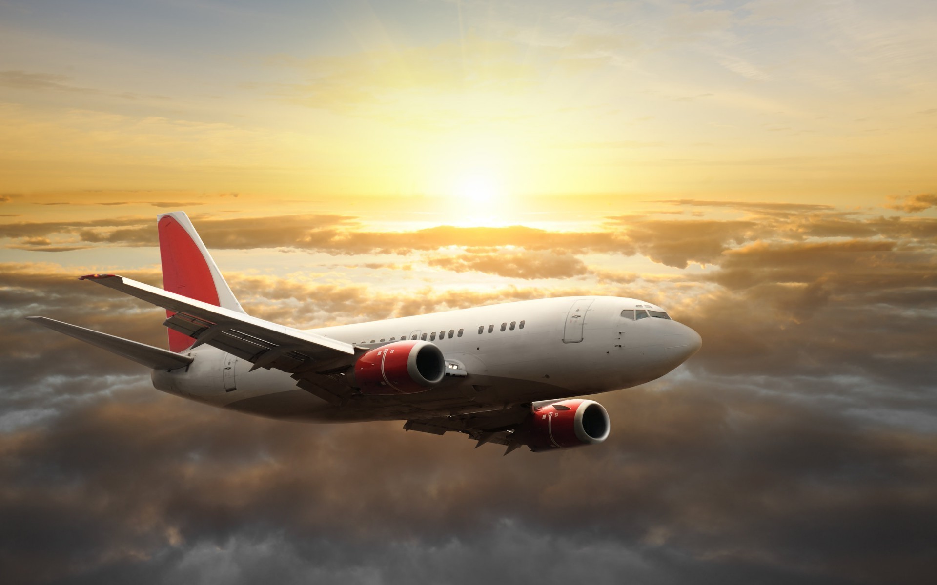 Fliegen in einem Flugzeug bei strahlendem Sonnenschein über den Wolken