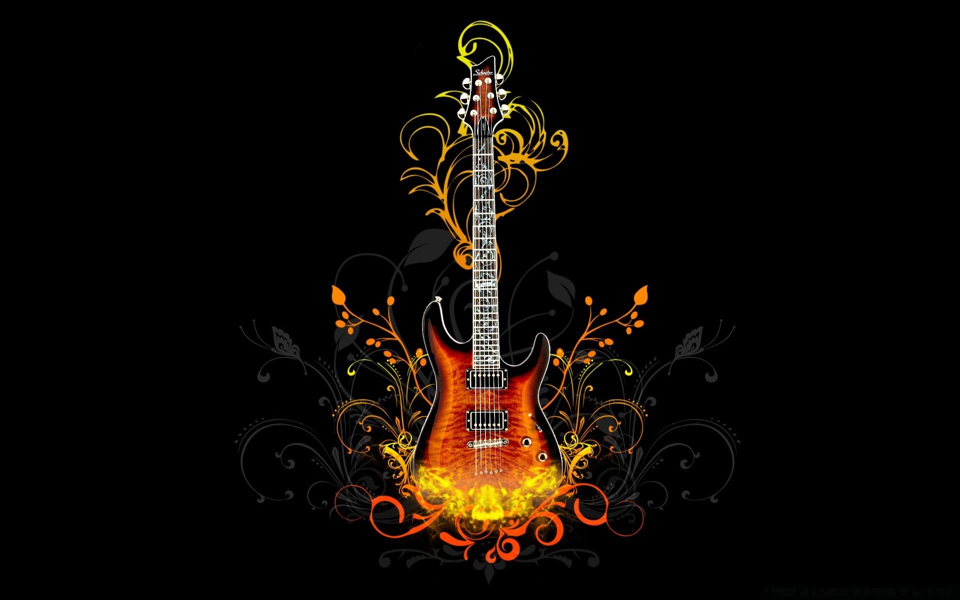 Orange Gitarre mit Mustern auf schwarzem Hintergrund