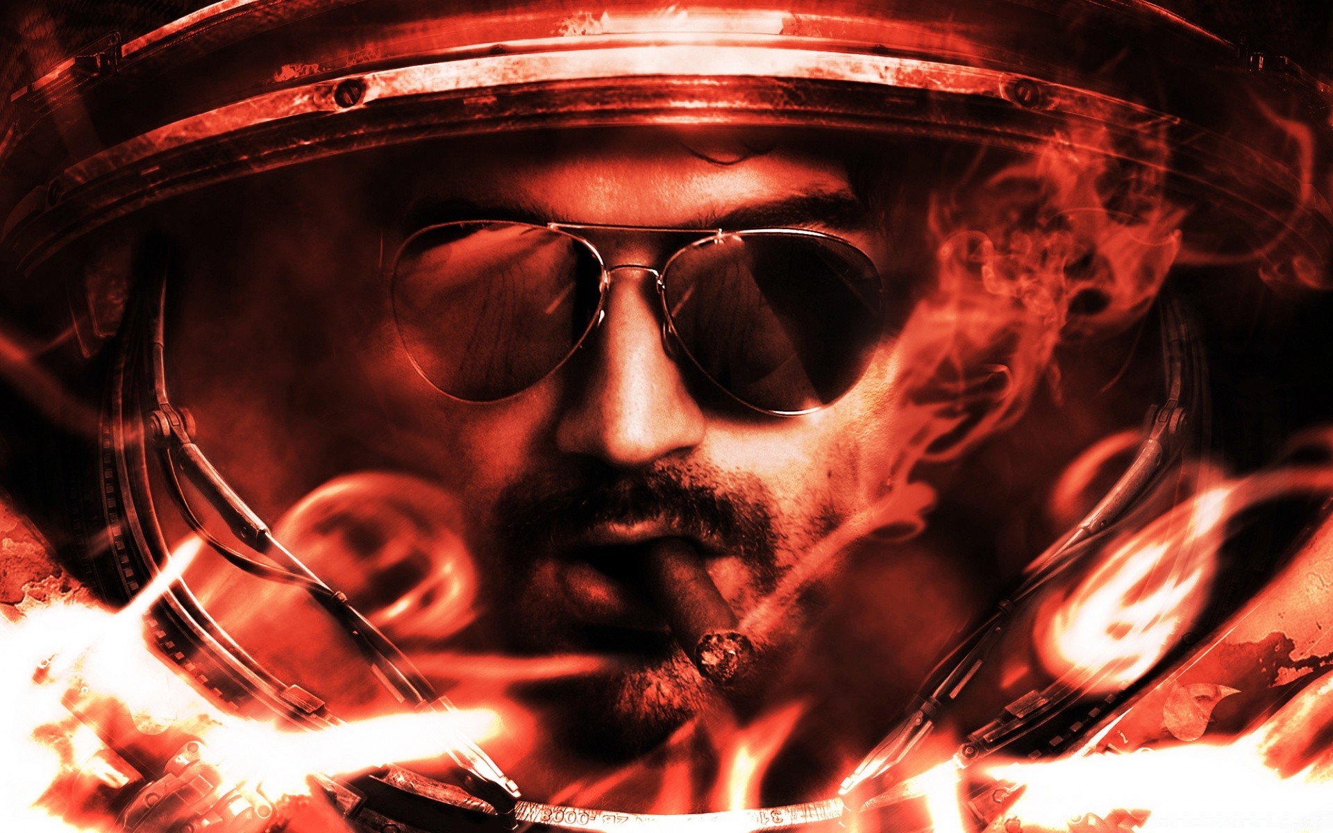 Mann im Anzug aus dem Spiel auf dem Hintergrund des Feuers