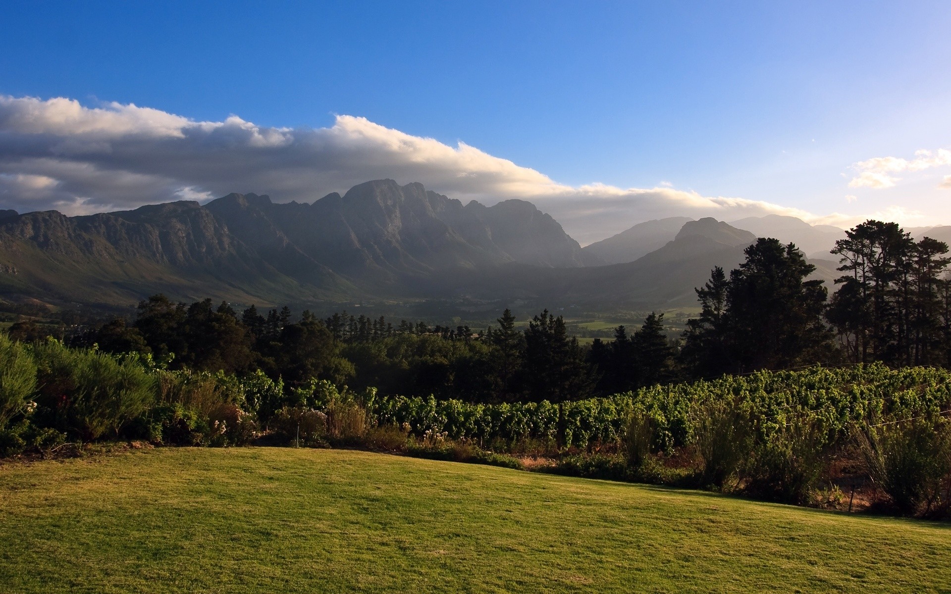 Blauer himmel, blendende sonne. ein grünes feld, das von der sengenden sonne beleuchtet wirdBlauer Himmel, blendende Sonne. Ein grünes Feld, das von der sengenden Sonne beleuchtet wird