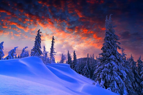 Weiße schneebedeckte Bäume auf dem Hintergrund des Nachthimmels