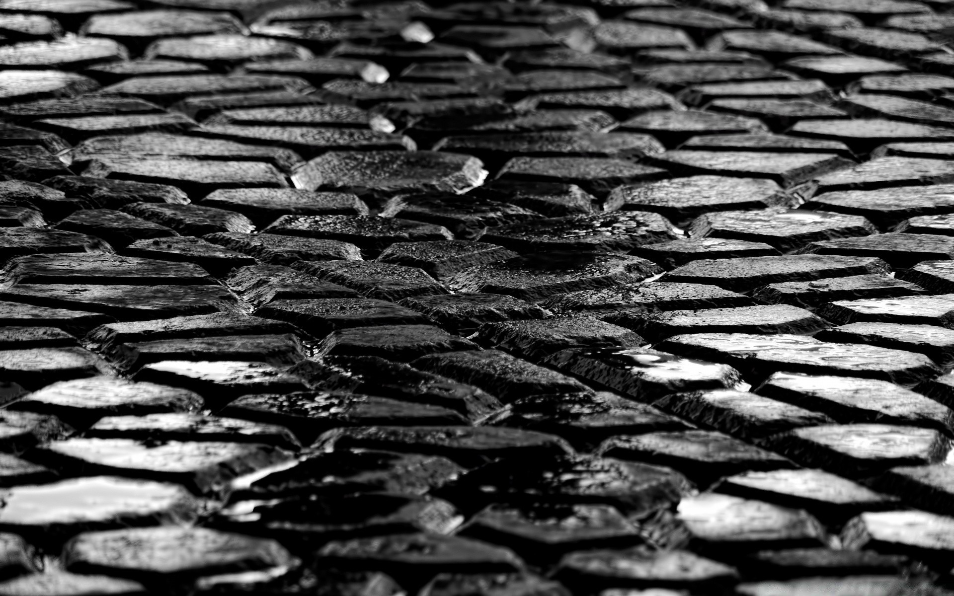 Pflasterstein mit nasser Spur vom Rad