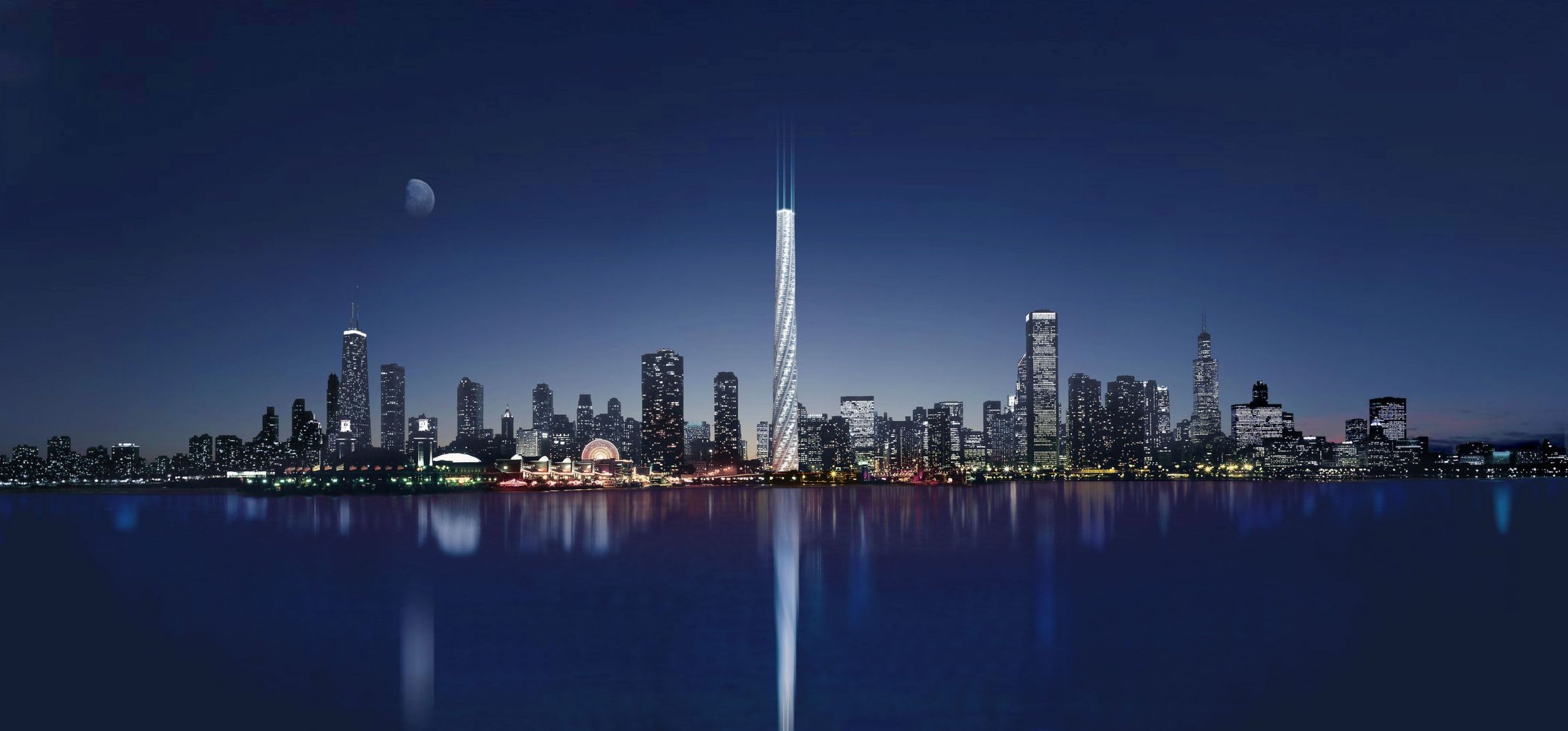 Architektur der Nachtstadt mit einer langen Brücke über der Wasseroberfläche