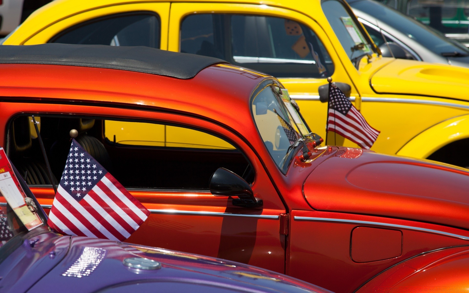 Helle Retroautos mit amerikanischen Flaggen